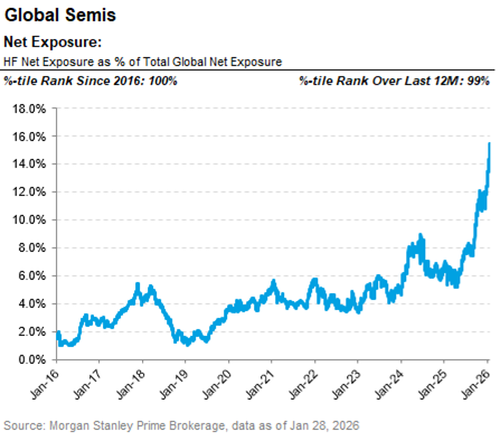 Extreme crowding in global semiconductors accelerated contagion: HF net exposure reached 16% of total global books (100th percentile since 2016, 99th over last 12 months), with YTD dollar buying in semis >5× any other industry, roughly half of all 2025 semis demand, and exceeding any non-semi industry’s full-year demand in 2025. This overcrowding explains why an AMD-related shock spread rapidly across AI/tech themes.