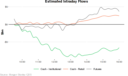 Estimated intraday flows illustrate the dynamic: institutional cash outflows dominated early (green line dipping), retail inflows lagged until later (orange line rising modestly), and futures provided some late support. The lack of balanced buying amplified velocity in momentum-sensitive names.