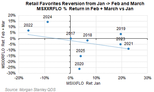 Retail Favorites (MSXXRFLO) fell -11% in the prior week (now only +2% YTD after +14% through late January), reflecting 84th-percentile overlap with momentum since 2017. Retail demand has historically faded into Tax Day (mid-April) due to liquidity drains from tax payments; January strength correlates negatively (~-34%) with February-March returns, often producing reversion as inflows slow post-strong January. Estimated rolling 1-week retail demand patterns show the typical seasonal decline approaching Tax Day, with 2026 tracking historical precedent closely; today’s subdued buying (16th percentile) fits fading support.