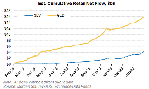 Cross-asset crowding adds pressure: HF exposure to Metals & Mining neared 86th percentile since 2010; retail cumulative net flows exceeded $20bn into GLD/SLV over the past year (accelerating until recently). MSXXRFLO now holds ~7 such stocks (double 2017-2024 average), while MSZZMOMO carries net +11% industry exposure (11% of long leg, 0% short leg).