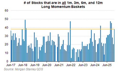 Momentum tenor overlap heightens vulnerability: 38 names appear in all four long momentum baskets (1m, 3m, 6m, 12m), near historic highs (>35 threshold). In prior episodes (sample of 9), subsequent 1-3 month returns for long momentum were negative. The largest overlapping names are semis-related, concentrating risk.