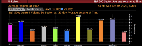 This bar chart shows today’s volume much higher than average across sectors (pink = current, blue = 20-day avg). High bars mean lots of trading—real money rotating out of momentum/AI into cyclicals/banks. Elevated volume confirms conviction in the shift.