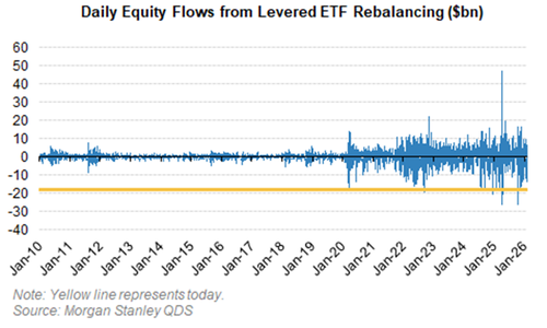 Mechanical supply intensified the move: levered ETF rebalancing generated ~$13bn in US equity supply (top 50 largest days ever), heavily concentrated in NDX/tech/semis with outsized single-name flows (> $100mm each in TSLA, NVDA, MU, PLTR, AMD, IREN). Levered ETFs maintain constant leverage by buying/selling underlying assets mechanically as prices change, often exacerbating intraday declines during momentum breaks.