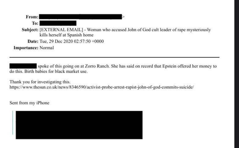 This revelation was brought to light in Epstein Files release EFTA00165118. In an email written between correspondents whose identities were redacted by the DOJ, the sender references an article published on the UK news outlet The Sun covering the suicide of Sabrina Bittencourt. Bittencourt, a victim of the Brazilian celebrity cult leader John of God (legal name João Teixeira de Faria), made famous by US talk show host Oprah Winfrey, alleged that the cult leader held young girls captive to breed them in order to sell their newborns on the black market before murdering the mothers. "Hundreds of girls were enslaved over years, lived on farms in Goias, and served as wombs to get pregnant for their babies to be sold," Bittencourt alleged. These same allegations were made against Epstein by the sender in the email disclosed in the latest batch of the Epstein Files, who wrote, "[REDACTED] spoke of this going on at Zorro Ranch. She has said on record that Epstein offered her money to do this. Birth babies for black market use."