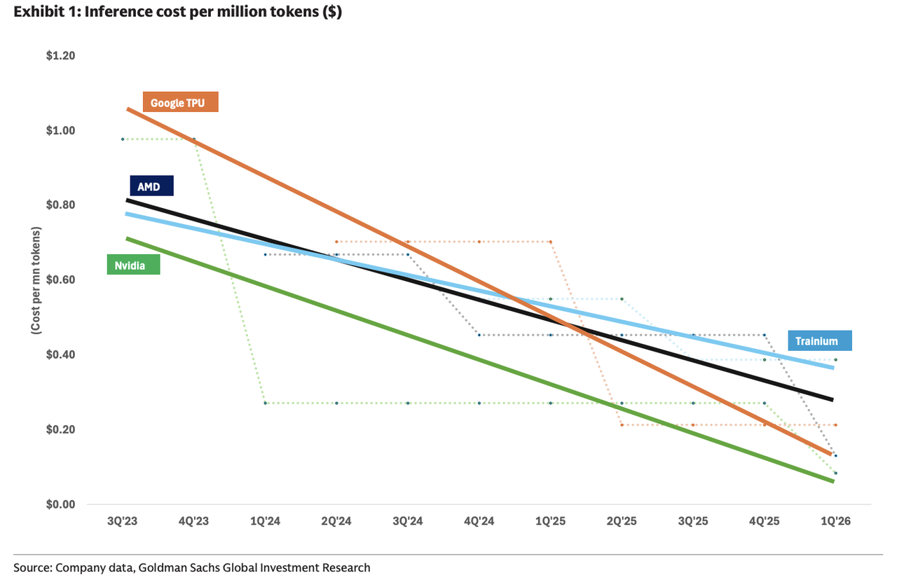 In response to investor questions on the GPUs vs. ASIC debate, we have attempted to quantify performance/cost dynamics by building an “inference cost curve” to compare solutions from different chip vendors and their competitiveness over time. We share our thoughts on the ongoing debate around competition between merchant solutions (Nvidia & AMD) and custom ASIC solutions (TPU & Trainium), and lay out four potential future scenarios for the evolution of AI. Our analysis suggests that Google/Broadcom’s TPU is rapidly closing the gap with Nvidia’s GPU solutions on compute cost performance, while Trainium and AMD are lagging.