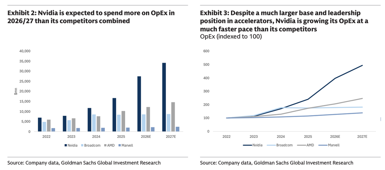 We expect Nvidia to remain ahead of competitive solutions in the near term as the industry continues to move at a rapid pace. As AI workloads and models continue to move at a rapid pace with more than a few vectors of growth still ahead of us (physical AI being the next industry demand driver in our view), we expect Nvidia to sustain its lead in the accelerator market driven by a combination of innovation across the full datacenter stack (hardware plus software). Although our cost analysis suggests that Google/Broadcom’s TPU v7 is on par with GB200 NVL72 on a cost-per-token basis, we note that Nvidia’s time to market remains fastest with an annual product launch cadence - and further performance improvements are expected with GB300 NVL72 (already shipping) and VR200 NVL144 (on track for 2H26 shipments). We believe this edge should help Nvidia to maintain its lead at many key customers, including hyperscalers outside of Google - where ASIC development efforts have progressed more slowly.