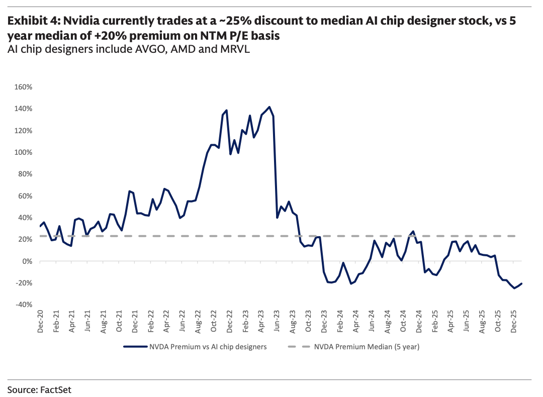 We believe structural questions on the sustainability of Nvidia’s competitive moat continue to weigh on the stock’s multiple. We believe dramatic cost reduction for inference applications is imperative for broader adoption and long-term profitability of the AI ecosystem. Given ASICs (especially TPUs) are already achieving significant cost reductions and converging toward parity with Nvidia solutions, Nvidia’s gross margins remain well ahead of competitors, and hyperscaler CapEx remains elevated with core LLM profitability still elusive, Nvidia’s stock multiple is under pressure. For context, NVDA has traded at a 25% discount to median AI-chip peers over the past two years vs. a 20% premium over a five-year lookback. For Nvidia’s stock to narrow that discount range or trade at a premium again, we believe we would have to see some combination of (1) LLM performance benchmarks of models trained on Blackwell which show a compelling performance step-up (as early as March 2026); (2) meaningfully lower cost per token for Nvidia vs. competing solutions; (3) monetization of AI in enterprise use cases.