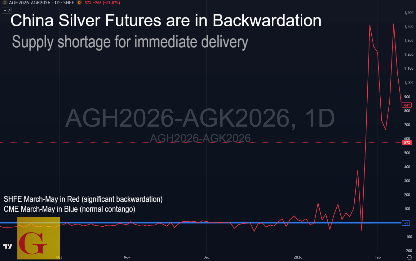 Domestic producers and traders are working through backlogs of orders as near-term prices rise relative to forward contracts. The front-month silver contract on the Shanghai Futures Exchange has climbed to a record premium over the next active month. The structure signals backwardation, a condition in which prompt metal commands a higher price than future delivery.