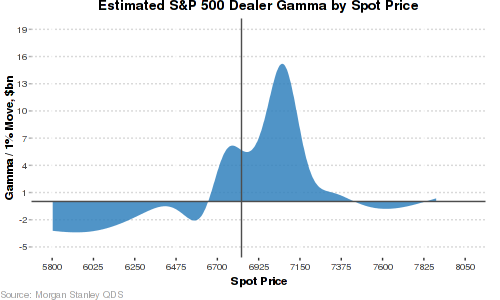 S&P dealers long gamma (they buy weakness/sell strength, capping big index moves); peak gamma at 7040-7070—limits volatility unless SPX drops materially (~-3% flip to short gamma).