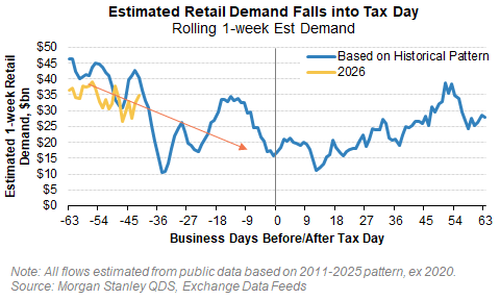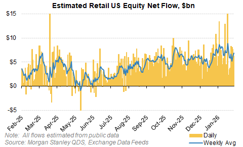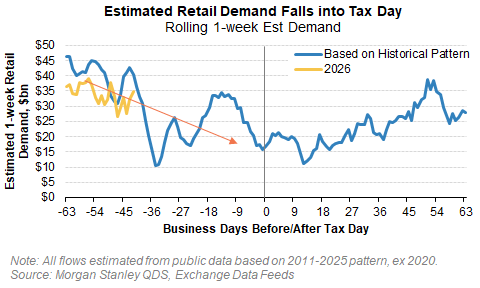 - Retail Favorites basket (MSXXRFLO) down -13% since Jan 22 (vs. SPX -1.1%)—already pricing some slowdown ahead of Tax Day; retail demand still solid (84th percentile 1Y) but expected to ease late Feb/early March.