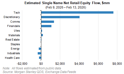 This was a positioning-driven reset—AI fears caused defensive rotation, HF de-risking (big net leverage cut), and mechanical supply. Macro remains supportive (strong jobs, cooling inflation), so likely tactical adjustment not regime change. Lower nets set up potential bounce, but crowded momentum/Semis + retail slowdown + ‘NVDA risk/surprise’ could bring more pressure or momentum late Feb/early March—MS favor dispersion plays (long defensives/hard assets, short vulnerable disrupt-ees).