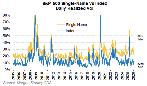 Dispersion (stock-by-stock moves) extreme (1-month S&P dispersion 95th percentile since 2005, driven by singles/themes not sectors)—index volatility low, but single-name volatility high.