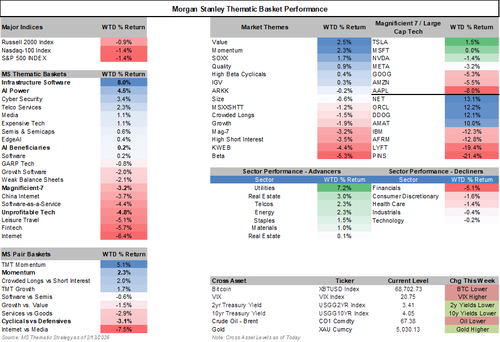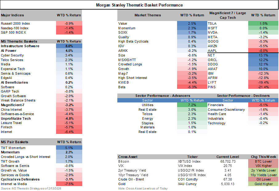 Stocks fell overall—S&P 500 (SPX) -1.3%, Nasdaq-100 (NDX) -1.4%, Russell 2000 (IWM) -0.8%—despite good economic news (strong January nonfarm payrolls jobs report and cooler January CPI inflation print). The drop came mainly from worries about AI disruption risk (how AI tools could hurt company profits long-term by replacing jobs or services) spreading beyond software to other areas like healthcare contract research organizations (CROs), insurance distributors, and logistics. The Morgan Stanley Broad AI Disruption basket (MSXXDIST, a custom index of stocks seen as vulnerable to AI replacement) fell -11% for the week. At the same time, higher memory costs (DRAM and high-bandwidth memory prices rising due to AI chip demand) hurt hardware companies—Apple -8% w/w was a big drag. PC market slowdown with Lenovo. This fear outweighed positive macro data and caused a shift to safer stocks.