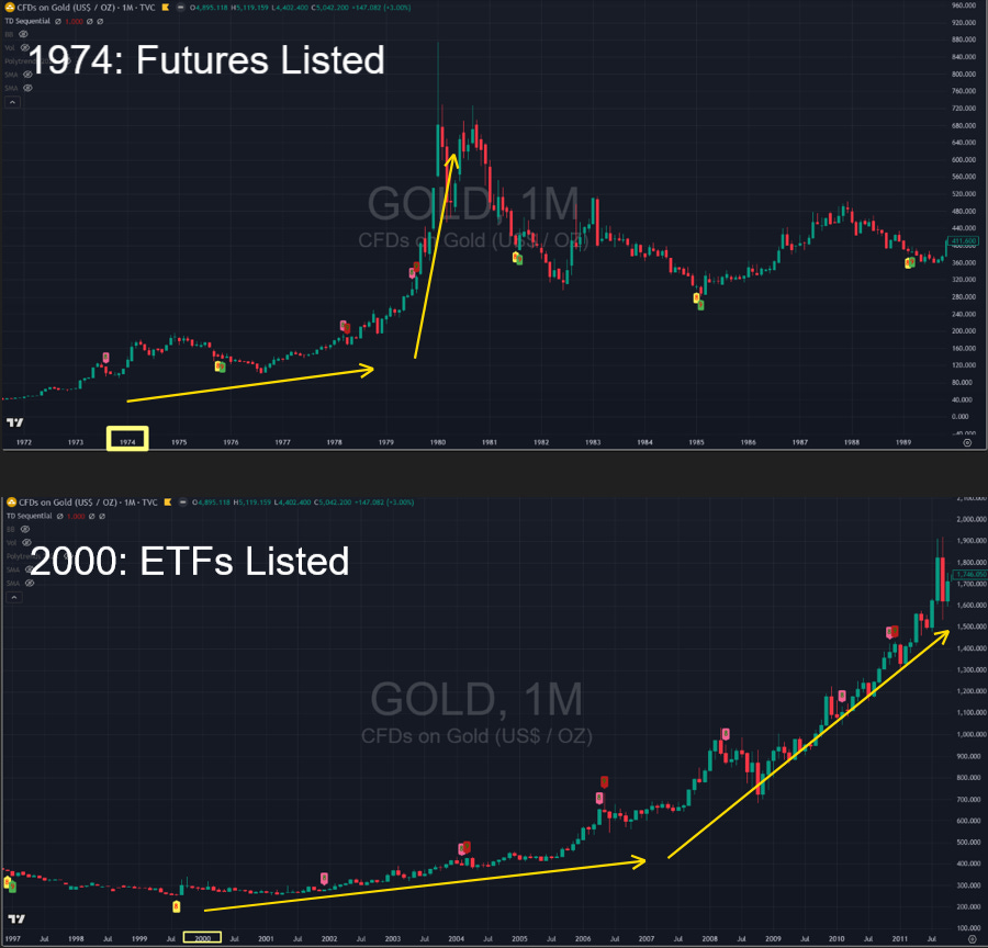 - Overall, it is a new ETF and will augur in a bigger bull market just as futures (1974) and GLD (2000) did before it. See pic…