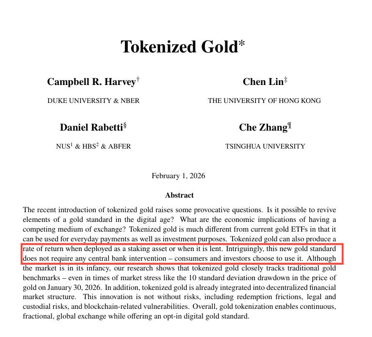 In Tokenized Gold, Campbell R. Harvey, Chen Lin, Daniel Rabetti, and Che Zhang examine whether tokenized gold instruments, specifically PAX Gold (PAXG) and Tether Gold (XAUt), satisfy the economic conditions required to revive elements of a gold standard in digital form . Their analysis focuses on pricing discipline, resilience during stress, and integration into modern financial infrastructure.
