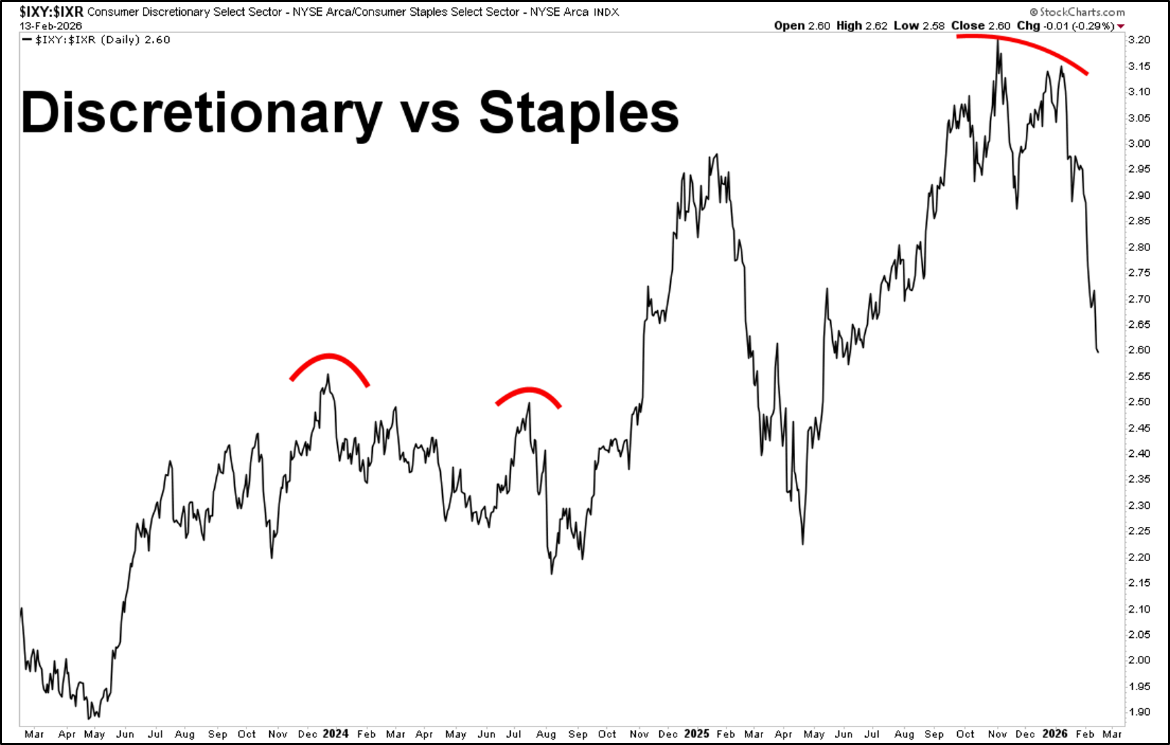 Discretionary vs Staples is oversold and ready for a reversion to the mean.