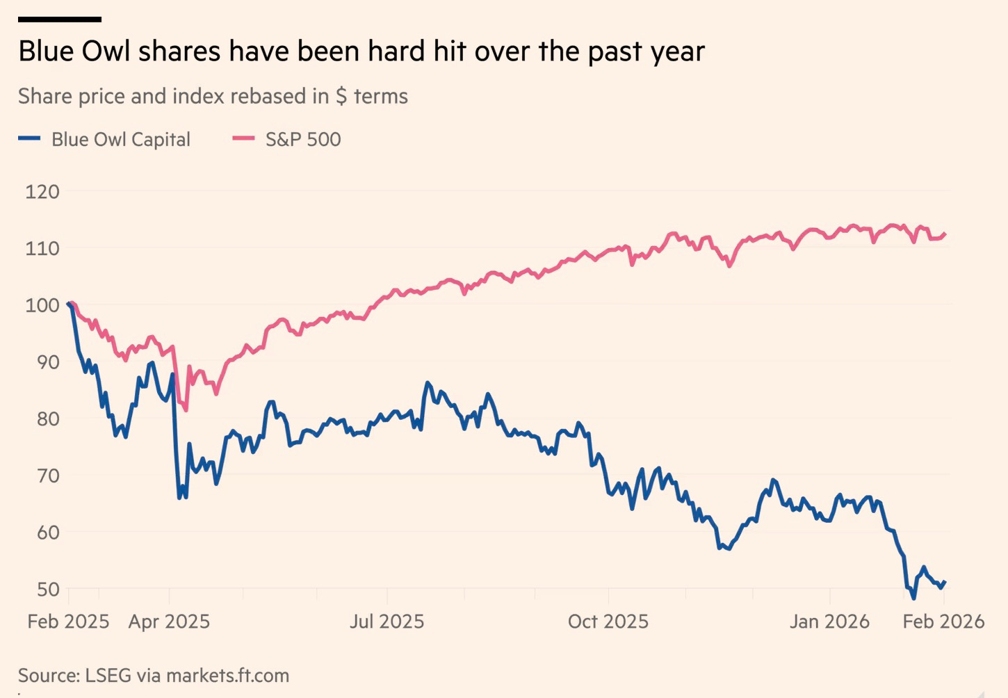 That sector is private credit, and the company was Blue Owl (OWL). According to the Financial TimesBlue Owl has permanently restricted redemptions from its retail private credit fund, Blue Owl Capital Corp II (OBDC II), reversing earlier plans to reopen quarterly withdrawals. Instead of allowing investors to redeem up to 5 per cent of net assets each quarter at stated value, the firm will now return capital through episodic distributions as it sells down assets over time.