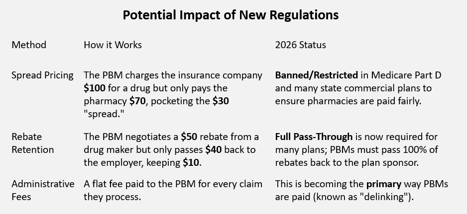 Consolidated Appropriations Act (CAA 2026): This legislation banned spread-based compensation, mandated rebate pass-through, and imposed extensive audit requirements. For PBMs that historically made most revenue from spread pricing and rebates, this is an existential threat.