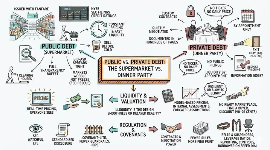 The difference between public and private debt is a bit like the difference between shopping at a supermarket and negotiating at a private dinner party. Public bonds are issued with regulatory fanfare, trade on exchanges like the New York Stock Exchange, come with SEC filings, credit ratings, clearing houses — the full transparency buffet. Prices update constantly, bid-ask spreads are tight, and if you want to sell, you can usually do it before your coffee gets cold. Even during the 2020 panic, markets wobbled but never truly froze — especially once the Federal Reserve stepped in with its rescue toolkit. Private debt, on the other hand, is bespoke tailoring. Every loan is a custom contract, negotiated quietly, documented in hundreds of pages, with no ticker symbol and no daily price. There are no public filings, rarely any ratings, and liquidity is more “by appointment only” than on demand. Sophisticated lenders may enjoy the information edge — but when it comes time to value or sell the loan, the absence of a visible market can feel less like exclusivity and more like being the only bidder at your own auction.