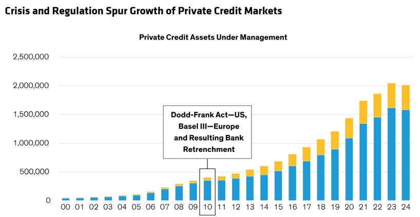 Private credit didn’t appear by accident — it was basically the financial system’s “nature abhors a vacuum” moment after the 2008 crisis. When Dodd-Frank Act and Basel III told banks to hold more capital, reduce leverage, and behave themselves, traditional lenders looked at middle-market loans and politely said, “No, thank you.” Balance sheets became precious, regulators became vigilant, and return-on-equity math became less forgiving. So, banks stepped back — especially from anything that looked remotely adventurous. Right on cue, private equity firms and credit funds marched in like well-dressed opportunists at a clearance sale. Pension funds hunting for yield, insurers craving spread income, endowments seeking diversification — all found comfort in private credit’s promise of 8–12% returns with valuations that moved about as calmly as a swan (at least on paper). Thanks to the Federal Reserve flooding the system with liquidity and pinning rates near zero, government bonds paid next to nothing. Private credit suddenly looked less like an alternative and more like the only party in town serving dessert.