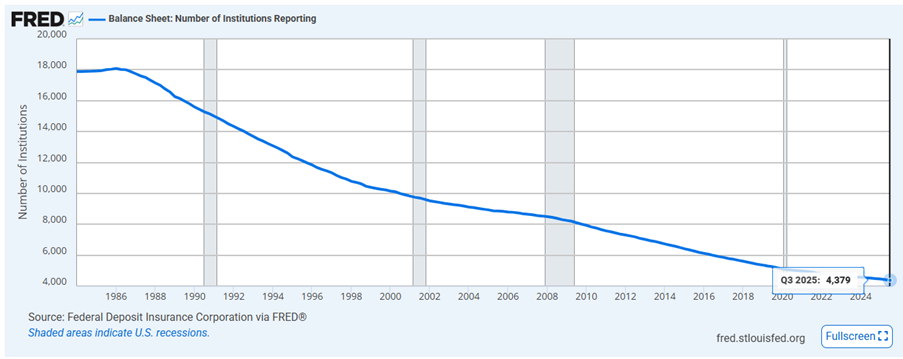 The birth of private credit is inseparable from the evolution — and gradual slimming — of the U.S. banking system. In the decades following World War II, America was home to roughly 13,000 to 15,000 banks, a dense forest of lenders serving businesses of all sizes. Then came the Savings and Loan crisis, which thinned the herd to about 8,000 institutions. A generation later, the Great Financial Crisis delivered a second consolidation wave, reducing the count to roughly 4,400 today. But it wasn’t just the number of banks that changed — it was their scale. The survivors grew larger, more regulated, and more focused on either very large corporate clients or ultra-safe lending. In Confucian terms: when the big fish grow fatter, the pond for the middle fish grows smaller. The result was a widening gap in middle-market lending — precisely the vacuum into which private credit stepped, offering capital where traditional banks increasingly could not, or would not, lend, especially in times of crisis.