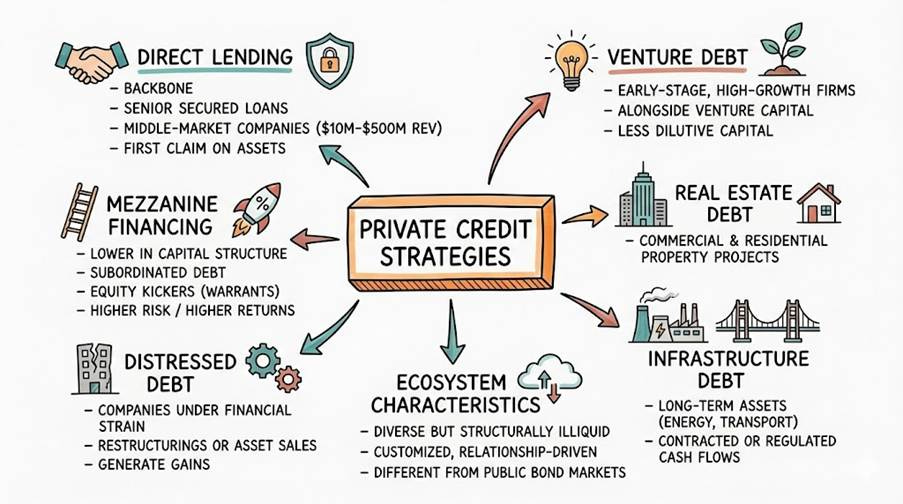 Within the bespoke Private Credit universe, several strategies coexist. Direct lending forms the backbone, providing senior secured loans to middle-market companies — typically firms generating between $10 million and $500 million in revenue — with lenders holding first claim on assets in the event of default. Mezzanine financing steps lower in the capital structure, offering subordinated debt often enhanced with equity kickers such as warrants, compensating investors for higher risk with higher potential returns. Distressed debt targets companies under financial strain, where lenders aim to generate gains through restructurings or asset sales. Venture debt supports early-stage, high-growth firms alongside venture capital, offering less dilutive capital. Real estate debt channels private financing into commercial and residential property projects, while infrastructure debt funds long-term assets such as energy facilities and transport systems, typically backed by contracted or regulated cash flows. Together, these segments form a diverse but structurally illiquid ecosystem — customized, relationship-driven, and fundamentally different from the public bond markets they increasingly rival in size.
