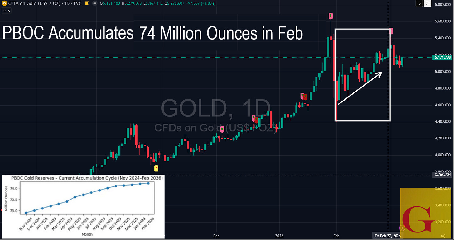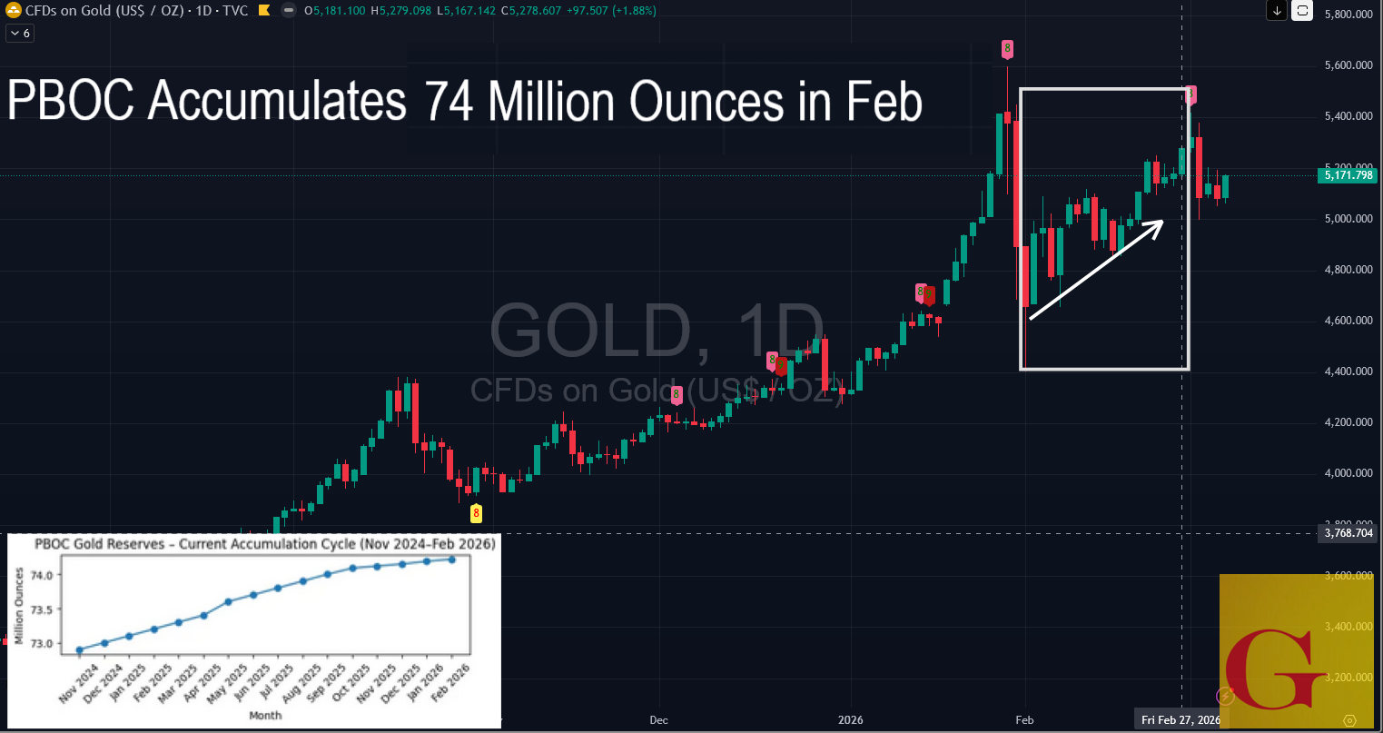 GFN – BEIJING: China’s central bank extended its gold-buying streak to 16 consecutive months in February, adding modestly to reserves as bullion trades above $5,000 per ounce amid escalating geopolitical tensions in the Middle East. Official data show holdings rising to 74.22 million fine troy ounces, bought between $4670 and $5270 in the month of February, reinforcing Beijing’s ongoing reserve diversification strategy.