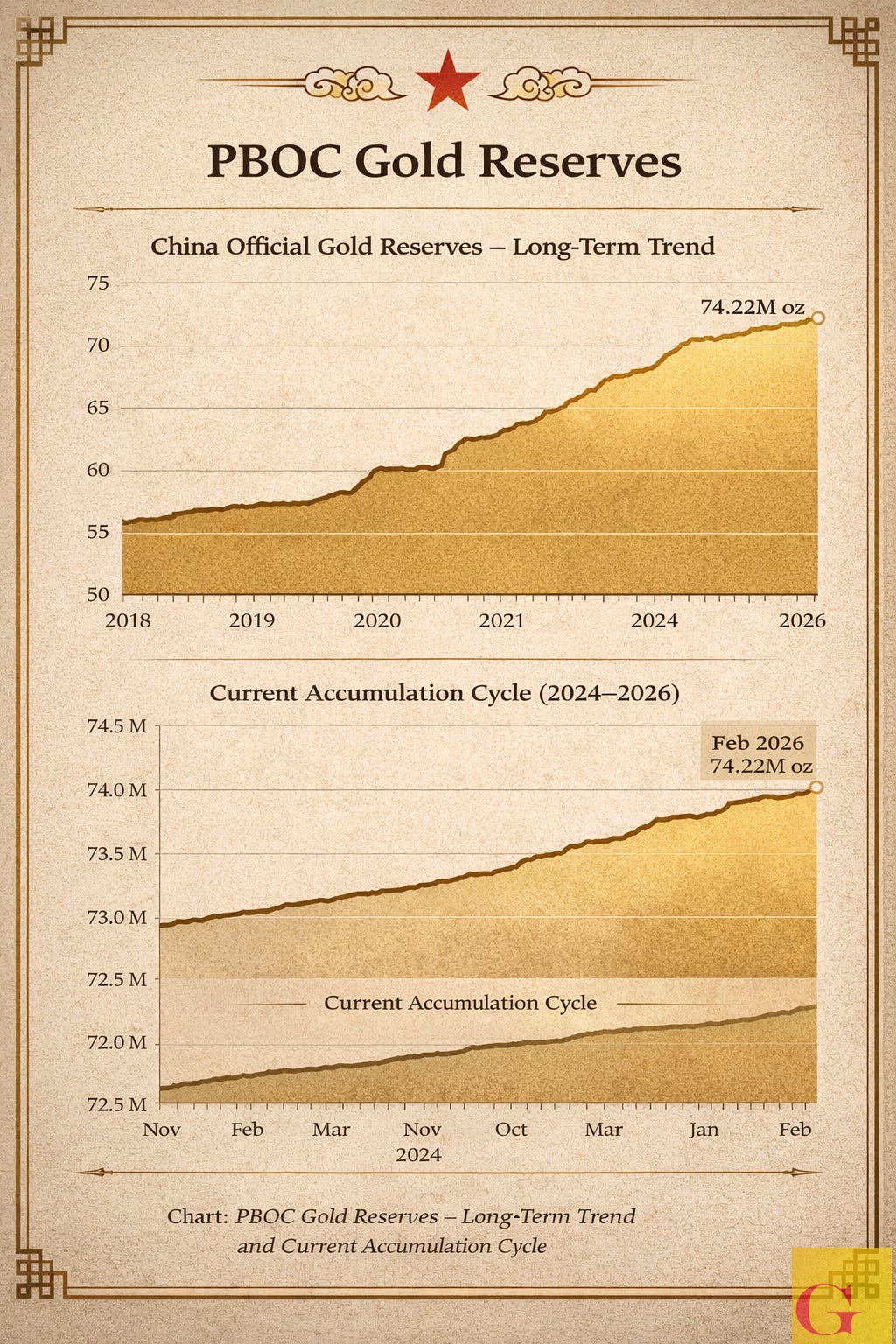 Data released Saturday showed the People’s Bank of China (PBOC) increased its gold reserves by roughly 30,000 troy ounces in February, bringing total official holdings to 74.22 million ounces. The latest addition continues a renewed accumulation cycle that began in November 2024, extending China’s steady official-sector demand for bullion.