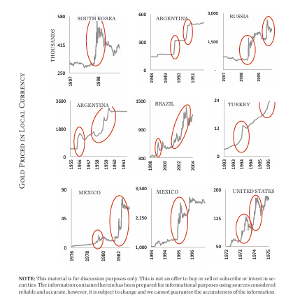 The report illustrates this dynamic through historical episodes where gold prices surged in local currency terms during periods of monetary instability. Examples include Argentina, Brazil, Turkey, Mexico, South Korea, Russia, and the United States during inflationary episodes. In each case, gold’s move accelerated sharply once confidence in the currency weakened.