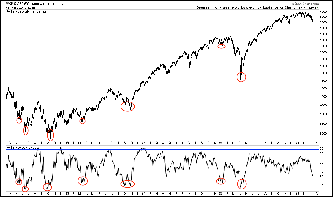 VERY IMPORTANT INDICATOR: % of stocks above the 50 day moving average. We would start to consider the S&P oversold when this indicator is below 25%
