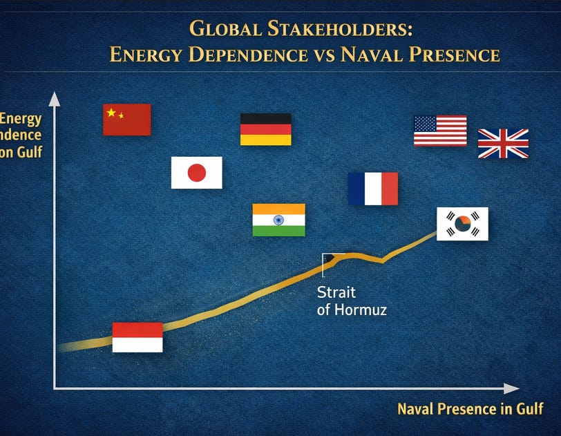 China has direct exposure as a major importer of Gulf energy. European powers, including France, retain capability and economic interest. Others benefit from the flow without contributing to its security. What remains unclear is whether dependence converts into participation.