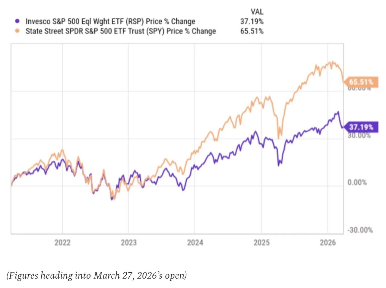 The divergence between the Invesco S&P 500 Equal Weight ETF (RSP) and the traditional cap-weighted S&P 500, typically represented by SPY, became one of the defining features of the market starting in early 2024. From roughly January 2024 through late 2025, SPY consistently pulled ahead of RSP.