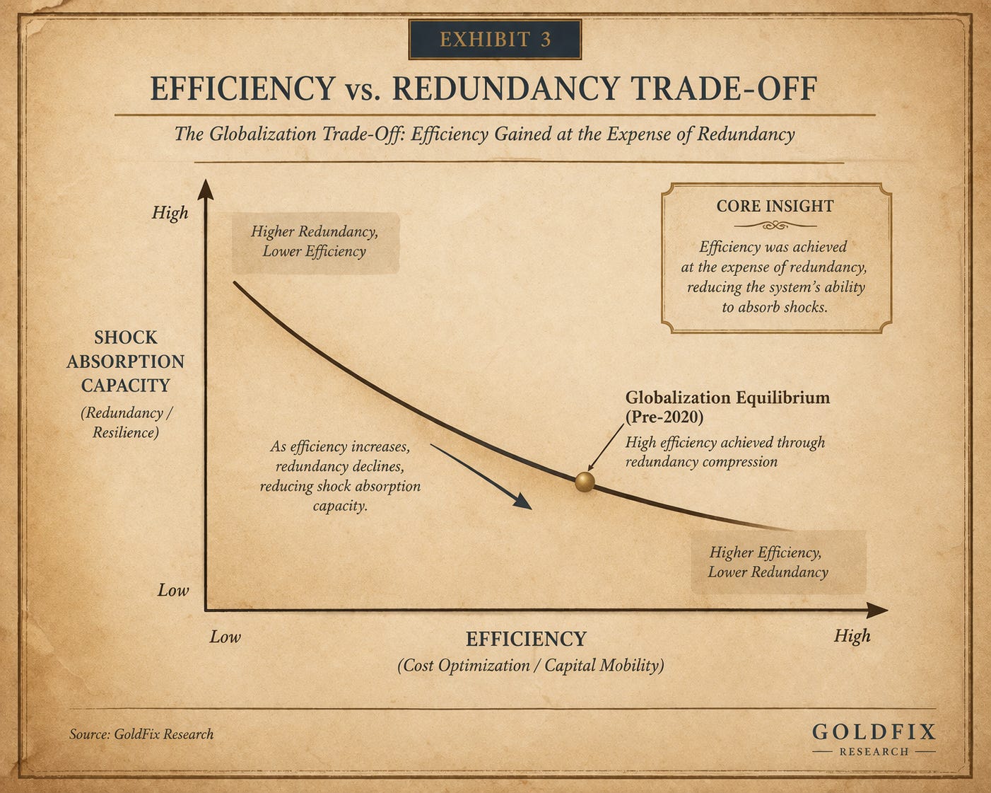 However, the system embedded a trade-off. Efficiency was achieved at the expense of redundancy. Redundancy, in turn, is the primary mechanism through which systems absorb shocks. By minimizing redundancy, the global economy increased its exposure to disruption.