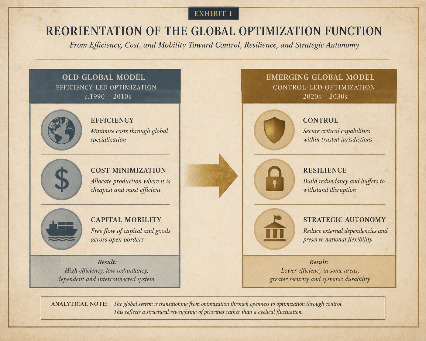 The current shift in the global economic system is frequently described as cyclical; however, the available evidence suggests a structural transition. The defining characteristic of this transition is a change in the system’s optimization function. For approximately three decades, the global economy operated under a model that prioritized efficiency, cost minimization, and capital mobility. That model is now being reoriented toward control, resilience, and strategic autonomy.