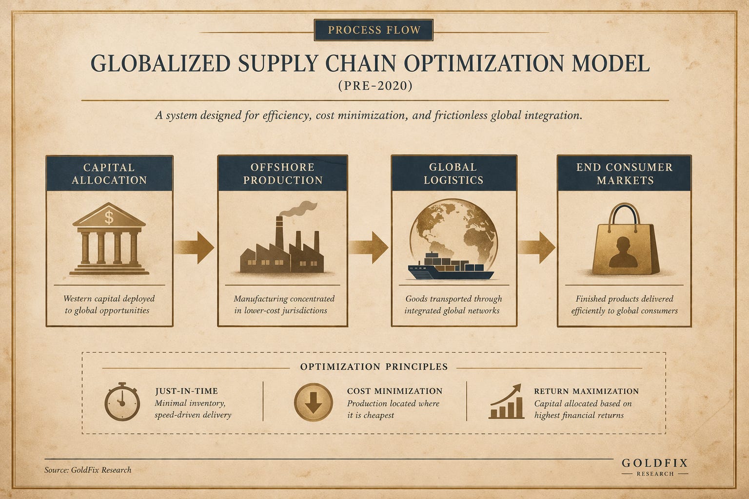 Within this framework, firms optimized for cost. Production migrated to lower-cost jurisdictions, inventory levels were minimized, and just-in-time delivery systems replaced stockpiling. Capital allocation followed return maximization, often independent of geographic or political considerations.