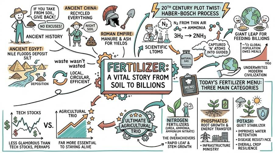 Long before spreadsheets and supply chains, farmers already knew a simple truth: if you take from the soil, you’d better give something back—preferably not just excuses. In Ancient Egypt, the Nile handled the job generously with its annual flood deposits; in Ancient China, farmers recycled everything short of philosophy itself (yes, including “night soil”); and the Roman Empire relied on manure and ash to keep yields respectable. Agriculture was local, circular, and, by necessity, efficient—waste wasn’t wasted. Then came the early 20th century plot twist: the Haber-Bosch process. Humanity essentially learned how to pull nitrogen out of thin air—quite literally—and turn it into ammonia using natural gas. A small step for chemistry, a giant leap for feeding billions. Roughly half the global population today owes its meals to this invention, which quietly underwrites modern civilization. Today’s fertilizer menu is neatly divided into three main categories: nitrogen, phosphate, and potash.