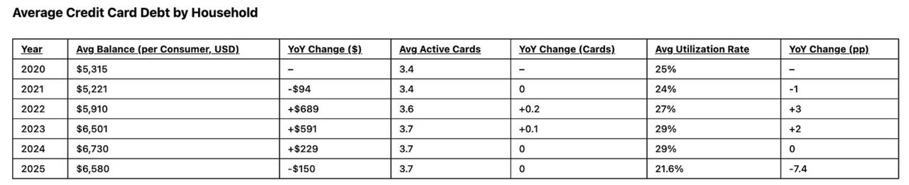 Credit card data looks increasingly fragile, with total balances now above $1.3 trillion and average borrowers carrying around $6,500 to $6,800 while struggling to pay it down. More importantly, this debt is no longer driven by discretionary spending but by essentials like food, housing, and utilities, meaning households are using credit as a lifeline, not a convenience.