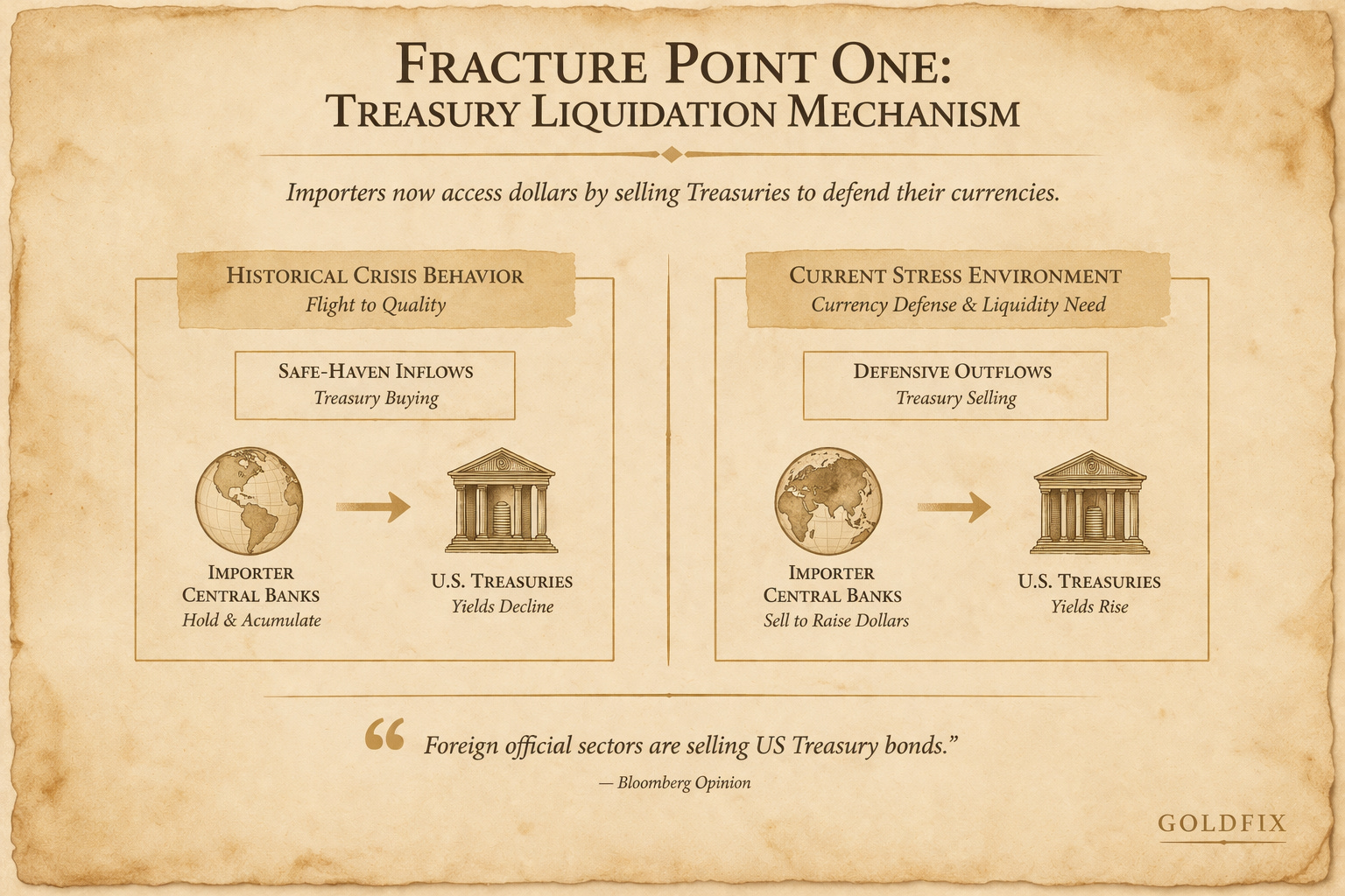 The mechanism reflects currency defense. Oil-importing economies such as Turkey, India, and Thailand face rising dollar-priced energy costs alongside weakening domestic currencies. Stabilization requires dollar liquidity, sourced through Treasury sales.