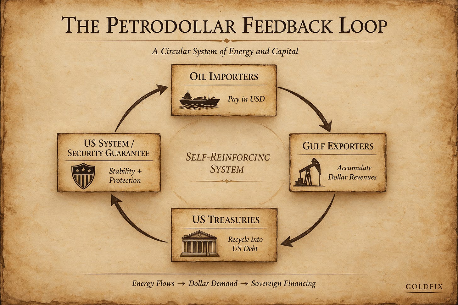 The longstanding financial arrangement in which the United States underwrote stability in the Middle East in exchange for Gulf states recycling dollar revenues into US Treasuries has fractured. What functioned for decades as a reinforcing loop between energy flows, dollar demand, and sovereign financing is now under strain.