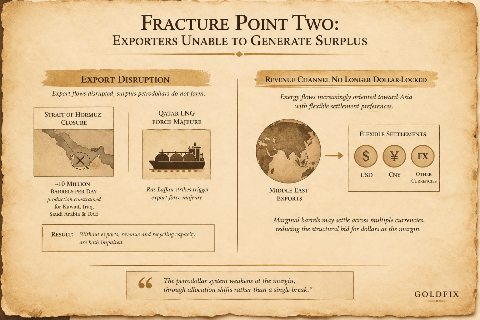 That structure depended on two continuous processes: surplus generation through energy exports, and reinvestment into US assets. Both are now disrupted.