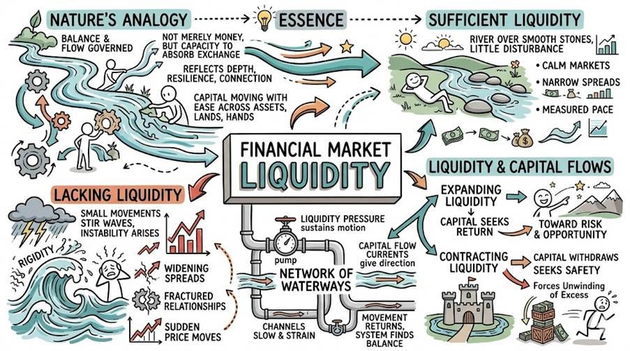 Financial markets follow the same order as nature, for they too are governed by balance and flow. Financial liquidity is not merely the presence of money, but the capacity of the system to receive and absorb exchange without disorder. It reflects depth, resilience, and the quiet connection between all pools of capital. Where liquidity is sufficient, great transactions pass as a river over smooth stones, leaving little disturbance; where it is lacking, even small movements stir waves, and instability arises. At its essence, liquidity is flow—capital moving with ease across assets, lands, and hands. When it is abundant, markets are calm, spreads are narrow, and change unfolds with measured pace. When it recedes, rigidity takes hold: spreads widen, relationships fracture, and price moves with sudden force. Liquidity and capital flows cannot be separated, for the latter is the visible path of the former. When liquidity expands, capital seeks its return, traveling toward risk and opportunity; when it contracts, capital withdraws, seeking safety, and in its retreat forces the unwinding of excess. Thus, the system resembles a network of waterways: liquidity is the pressure that sustains motion, and capital flows are the currents that give it direction. When the pressure is diminished, all channels slow and strain; when it is restored, movement returns and the system finds its balance once more.
