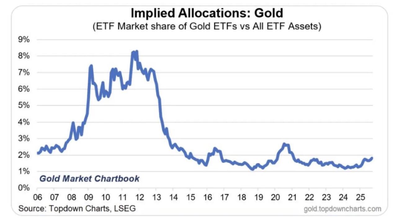 And as we said in our last letter, we are still in the early innings of this ball game. Consider the next chart below. Many investors and index funds choose ETFs as a way to gain exposure to an asset. This chart shows the market share of Gold ETFs compared to all other ETFs. Note that the present share is under 2%. In the 2000–2008 bull market, it was 4x this level and even in the 2016–2020 mini bull market it was almost 50% higher. We believe this current bull market will be larger than both of those. If we are correct, Gold prices will travel much higher.