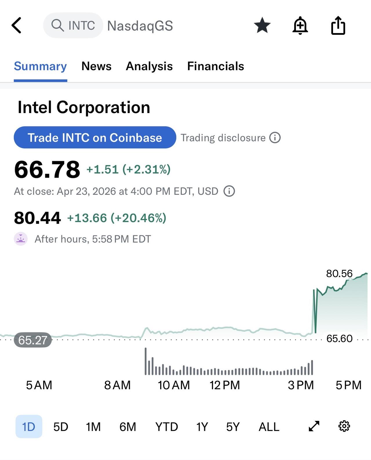 By today’s close, CAR had fallen 67.97% from the April 21 close and 70.49% from the April 22 open. Those were two great calls. Time to add another one to the list: Time To Get Back Into Intel.
