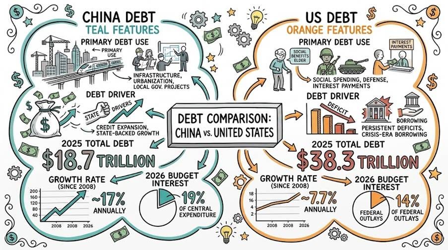 Not all debt is invited to the same banquet. When a state borrows to build roads, ports, and industries—as in the case of China—the debt at least brings tools to work and may one day repay its host with greater prosperity. But when a state borrows to consume—to fund endless trinkets, generous social promises, and distant geopolitical adventures—as in the United States—the debt arrives empty-handed, eats heartily, and leaves the bill for future generations. One might say the first plants an orchard and hopes for fruit, while the second hosts a perpetual feast where the guests grow louder, the dishes more extravagant, and the kitchen increasingly indebted. In both cases, the tea must eventually be paid for—but only one has a chance of having grown the leaves.