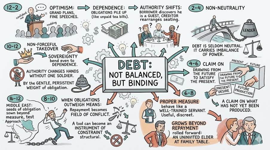 At its root, debt is a claim upon what has not yet been produced. It draws from the future to satisfy the present, sustained by laws, institutions, and the authority of the state. When governed with discipline, it may serve order and development. But when it grows beyond the capacity to be honoured, it loses harmony. What was once a tool can become an instrument of constraint—not by intent, but by structure. Thus, the wise understand that conflict need not arise from force alone. When obligations outweigh means, the act of repayment itself becomes a field of contest. No armies are required when imbalance has already taken hold. In this, one may observe the present condition of the Middle East, where the seeds of obligation have been sown beyond measure, and the test of balance approaches.