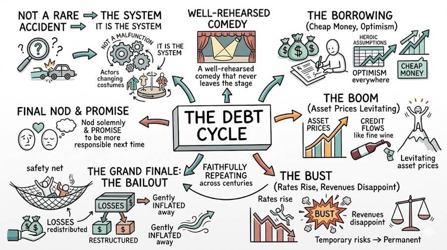 The debt cycle is often treated like a rare accident, when in reality it behaves more like a well-rehearsed comedy that never leaves the stage. First comes the borrowing—money is cheap, optimism is everywhere, and everyone suddenly becomes a visionary with spreadsheets full of heroic assumptions. Then arrives the boom, where asset prices levitate, credit flows like fine wine, and confidence reaches a level usually reserved for lottery winners. Inevitably, the bust crashes the party—rates rise, revenues disappoint, and all those “temporary” risks reveal their permanent nature. Finally, the grand finale: the bailout, where losses are politely redistributed, quietly restructured, or gently inflated away, allowing everyone to nod solemnly and promise to be more responsible next time. It is not a malfunction of the system—it is the system, faithfully repeating its favourite joke across the centuries, with only the actors changing costumes.
