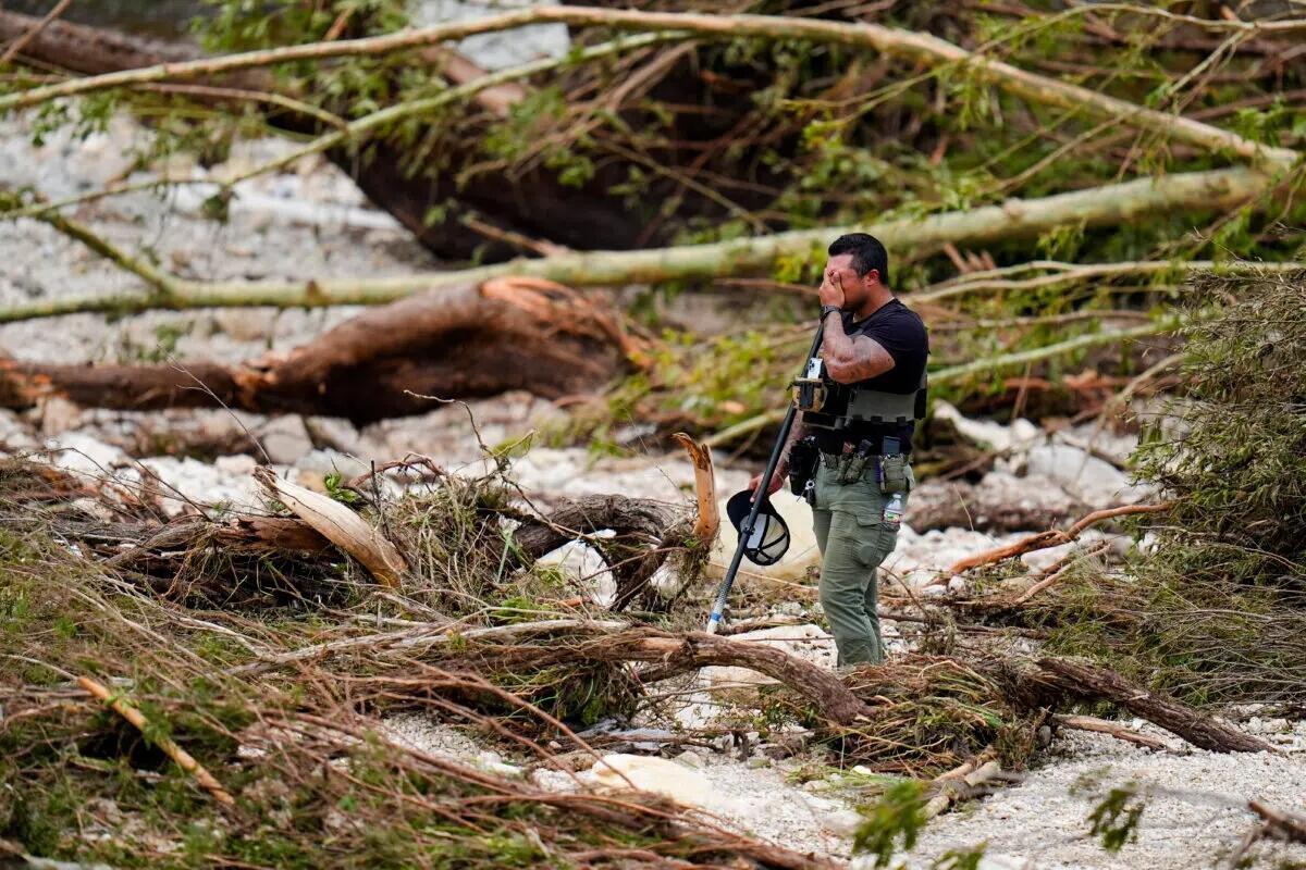 A sheriff's deputy pauses while combing through the banks of the Guadalupe River near Camp Mystic after a flash flood swept through the area in Hunt, Texas, on July 5, 2025. Julio Cortez/AP Photo