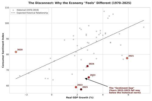 If you look not at whether sentiment is correlated with growth, but at absolute levels, the situation is even more clear. Growth has been pretty good from 2021-2025, but the public is really mad.