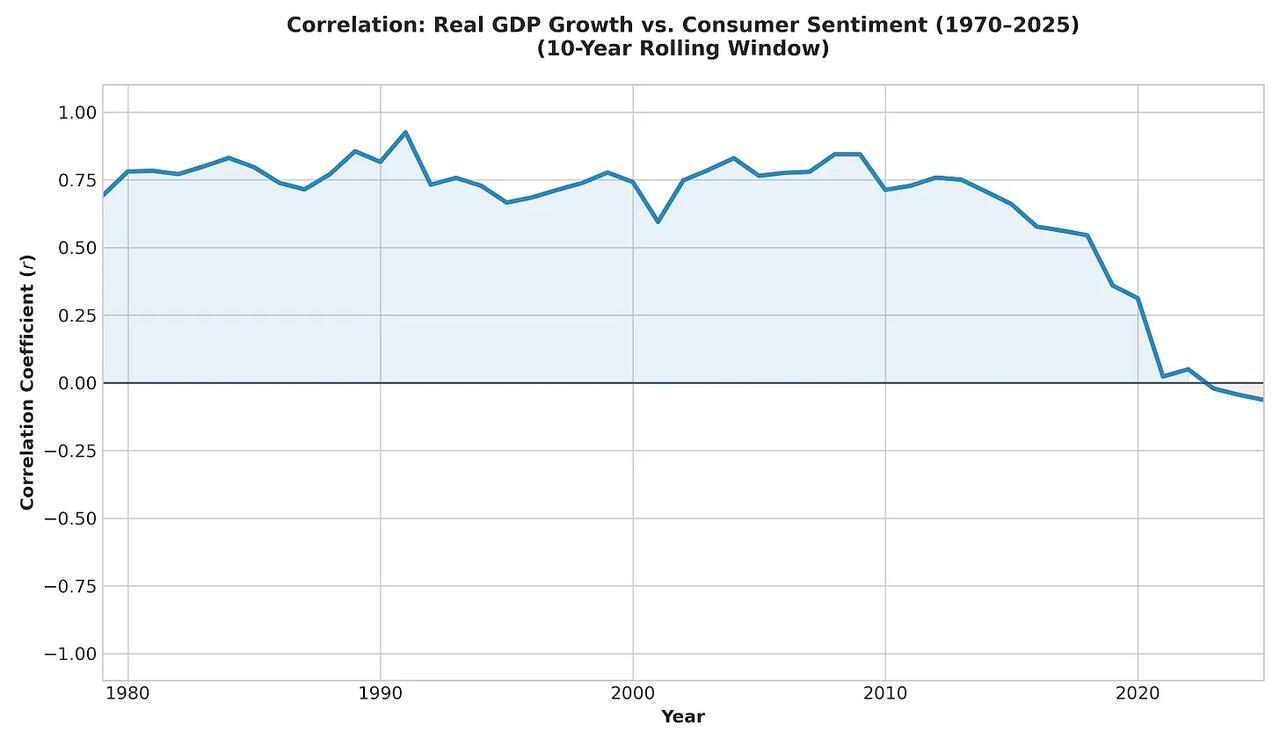 This observation isn’t a commentary about Biden or Trump, but about a structural change in the economy. You can see how people think about economic growth itself has shifted. Here’s the relationship between growth and consumer sentiment. They used to rise in parallel, higher growth meant more consumer confidence, but they started breaking down in the mid-2010s, and fell apart completely post-Covid.