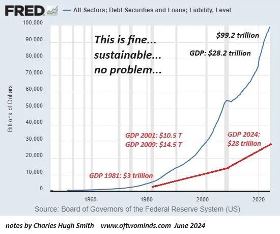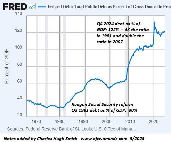 Apologists love to attribute the debt to inflation or "growth," but that's misdirection. As a percentage of the nation's GDP (gross domestic product), the debt has risen 4-fold since president Reagan shepherded Social Security reforms in the early 1980s, and doubled as a percentage of GDP since 2007, before the Federal Reserve bailed out the status quo with hyper-financialization.